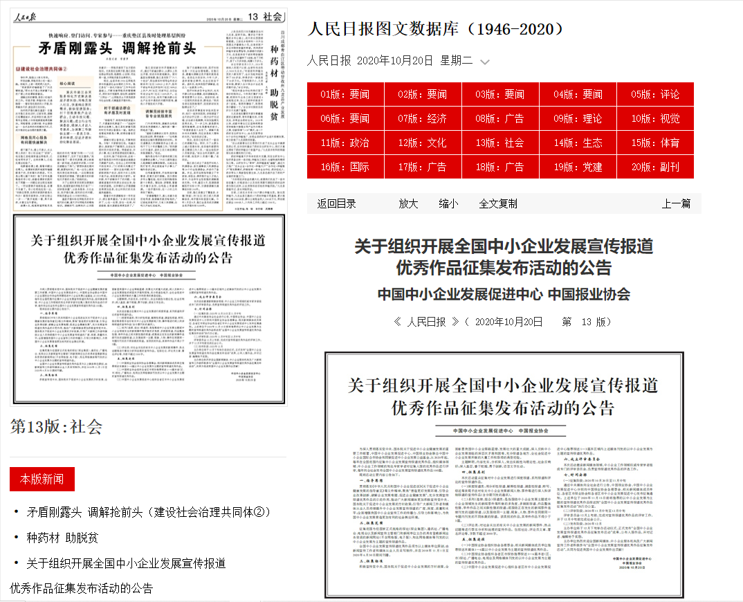 10月20日,《人民日報(bào)》第13版用半版版面刊發(fā)了《關(guān)于組織開展全國中小企業(yè)發(fā)展宣傳報(bào)道優(yōu)秀作品征集發(fā)布活動(dòng)的公告》,人民網(wǎng)、學(xué)習(xí)強(qiáng)國等中央媒體和中宣部新媒體學(xué)習(xí)平臺(tái)及時(shí)對(duì)本項(xiàng)活動(dòng)做了重點(diǎn)推薦,引發(fā)社會(huì)各界廣泛關(guān)注;截至發(fā)稿日,學(xué)習(xí)強(qiáng)國刊發(fā)此項(xiàng)活動(dòng)的公告消息稿,瀏覽量達(dá)6萬多人次,收獲點(diǎn)贊數(shù)2000多個(gè)。